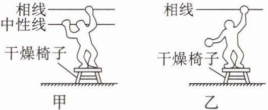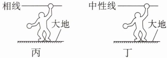 解析:甲图中人站在干燥的椅子上,两只手同时分别触摸相线和中性线,两手间的电压为220V,有电流通过人体,会触电;乙图中人站在干燥的椅子上,单手接触相线,不会形成电流的通路,不会触电;丙图中人站在地面上,单手接触相线,相线和大地之间的电压为220V,有电流通过人体,会触电;丁图中人站在地面上,单手接触中性线,中性线和大地之间的电压为0,没有电流通过人体,不会触电。所以,会发生触电事故的是甲、丙。