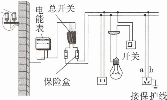 解析:电能表是测量家庭电路中消耗电能多少的仪表,故A错误;铜丝和铁丝的熔点较高,不能及时熔断,起不到保护作用,故B错误;控制灯泡的开关和它所控制的灯泡是串联的,开关必须接在相线和用电器之间,故C错误;三孔插座的正确接法是“左中性线右相线上接保护线”,连接三孔插座的导线中,a导线是中性线,b导线是相线,a、b外的导线是保护线,故D正确。故选D。