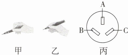 解析:观察甲、乙两图可知,乙图中测电笔的金属笔卡没有和手接触,无法形成回路,正确的使用方法如甲图所示;三孔插座要求左接中性线,右接相线,上接保护线,由图丙可知,A孔是与保护线相连的,这样可防止用电器的金属外壳带电时造成触电事故。