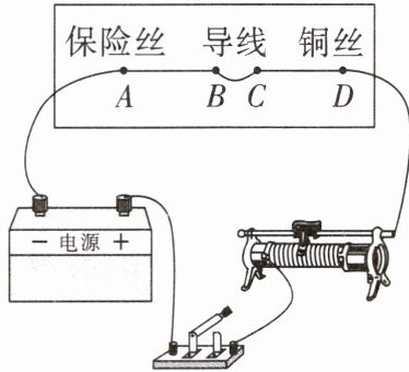 1. 将长短、粗细均相同的保险丝和铜丝分别接到线路板上 $ A $、$ B $ 间和 $ C $、$ D $ 间,如图所示。闭合开关,移动滑动变阻器的滑片,发现保险丝熔断而铜丝完好。下列说法错误的是(