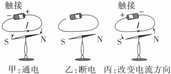 解析:丹麦物理学家奥斯特是世界上第一个发现电与磁之间联系的人,发现了电流的磁效应;比较图甲和图丙,电流方向改变,小磁针偏转方向改变,说明电流产生的磁场方向与电流的方向有关。