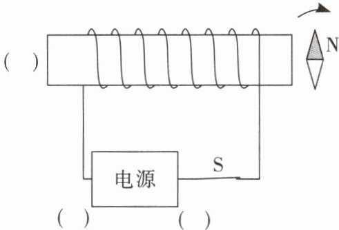 [变式](2024乐山)如图所示,闭合开关S后,位于螺线管右侧的小磁针N极顺时针旋转90°。请在对应括号中标出电源的“+”“-”极和通电螺线管左侧的极性。