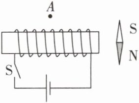 解析:闭合开关S后,根据安培定则可知通电螺线管的右端为N极、左端为S极;在磁体的外部,磁感线从N极指向S极,所以通电螺线管外A点的磁场方向向左,故A、B错误;通电螺线管的右端是N极,根据磁极间相互作用的规律可知,小磁针的N极应远离螺线管的右端,即小磁针的N极指向右,故C错误,D正确。