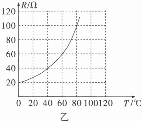 (2)衔铁刚跳起时,温度为80℃,由图乙知热敏电阻R=100Ω。控制电路总电阻R总=R0+R=50Ω+100Ω=150Ω,电流I=U1/R总=3V/150Ω=0.02A。此后衔铁跳起,动触点接a,工作电路R1与R2串联,总电阻R=836Ω+44Ω=880Ω,电功率P=U2²/R=(220V)²/880Ω=55W。