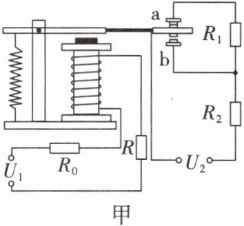 [变式2]为实现自动控制,小明同学利用电磁继电器(电磁铁线圈电阻不计)制作了具有延时加热、保温、消毒等功能的恒温热水器,其电路图如图甲所示。控制电路中,电压$U_1= 3V,$定值电阻R₀= 50Ω,热敏电阻R的电阻随温度变化的图像如图乙所示;工作电路中,电压$U_2= 220V,R_1= 836Ω,R_2= 44Ω。$已知恒温热水器盛水2kg,水温达到80℃时衔铁会跳起。[水的比热容为$4.2×10^3J/(kg·℃)]$