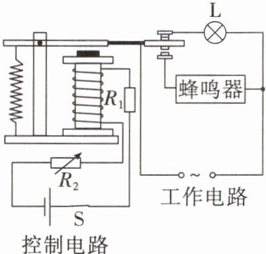 解析:当温度升高到报警温度时,指示灯熄灭,蜂鸣器报警,说明衔铁被吸下,电磁铁的磁性增强,电路中的电流变大了,根据欧姆定律可知,电路中的总电阻变小$,R_1$的电阻变小了,即热敏电阻$R_1$的电阻随温度的升高而减小,故A错误,B正确;控制电路的报警电流大小一定,即报警时控制电路总电阻一定,报警温度越低,热敏电阻的电阻越大,总电阻不变,应将$R_2$的电阻调小,故C错误;若控制电路电源电压降低,要使控制电路电流达到报警电流,根据欧姆定律,电路总电阻要变小,才能使衔铁被吸下来,因为热敏电阻$R_1$的电阻随温度的升高而减小,所以报警温度将升高,故D正确。故选BD。