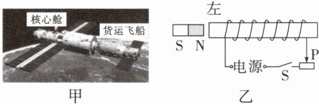 6. 2024年1月18日,天舟七号货运飞船与中国空间站成功对接(如图甲)。当货运飞船和核心舱相互靠近时,为减缓撞击带来的影响,货运飞船与核心舱间需配置缓冲装置。“飞天”兴趣小组根据以上信息,结合物理知识,设计了如图乙所示的缓冲装置简化图。闭合开关S,当条形磁体和通电螺线管靠近时,产生相互排斥的力,说明通电螺线管左端为