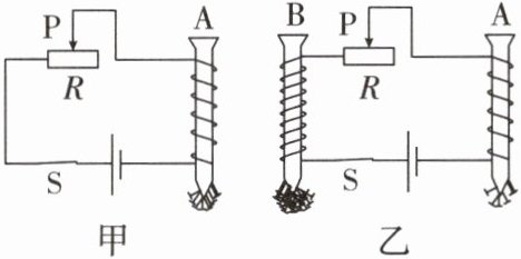 (2)如图乙所示,把电磁铁A和B串联,闭合开关S,多次移动滑动变阻器的滑片P,发现电磁铁B总能吸引更多的大头针。通过比较,得出的结论是