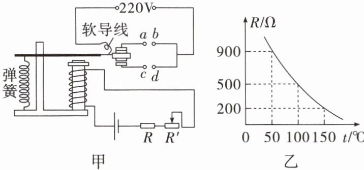 当$R' = 50\Omega$,控制电路电源电压$U_{控}=36V$,此时电路总电阻$R_{总}=\frac{U_{控}}{I}=\frac{36V}{0.036A}=1000\Omega$。热敏电阻$R = R_{总}-R_{线圈}-R'=1000\Omega - 50\Omega - 50\Omega = 900\Omega$。由图乙可知,当$R = 900\Omega$时,$t = 50^{\circ}C$。
