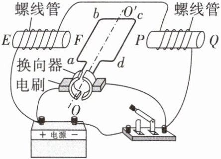 [变式2]如图所示为某电动机的原理图,EF、PQ为螺线管,abcd为电动机的线圈,OO'为转轴。闭合开关,从O点沿转轴观察,线圈顺时针转动,则(