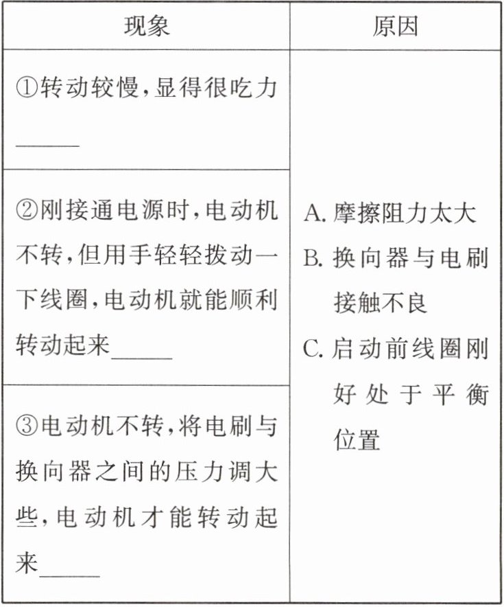 |A. 摩擦阻力太大|B. 换向器与电刷接触不良|C. 启动前线圈刚好处于平衡位置||②刚接通电源时,电动机不转,但用手轻轻拨动一下线圈,电动机就能顺利转动起来