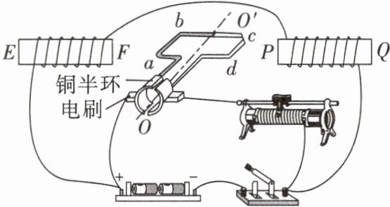 11. 如图所示为某电动机的原理简图,$ EF $、$ PQ $ 为螺线管,$ abcd $ 为电动机的线圈,$ OO' $ 为转轴,电源电压恒定。闭合开关后,从 $ O $ 点沿转轴观察,线圈顺时针转动,则