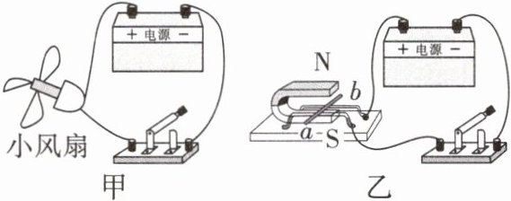 9. 如图甲所示是小明自制的小风扇,使用时发现小风扇转动,但风却向后吹。小明设计了如图乙所示的实验,探究其原因。