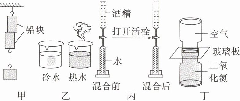 C.图丙:将一定量水与酒精混合后总体积变小,说明分子间存在间隙