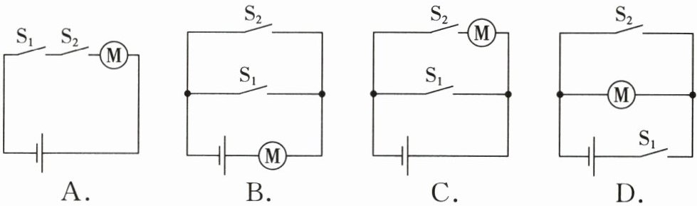 5. 中国高铁技术世界领先,给人们出行带来极大的便利。乘客进站时,需同时通过身份证验证(相当于闭合$S_{1}$)和人脸识别(相当于闭合$S_{2}$),方可开启闸机$M$。下列电路设计符合要求的是(
