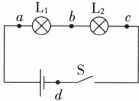 7. 如图所示电路,开关闭合后,两灯都不亮,用一根导线连接$a$、$b$两点后,两灯仍不亮,再用这根导线连接$b$、$c$两点后,两灯还是不亮,仍然用这根导线连接$b$、$d$两点后,灯$L_{1}亮而灯L_{2}$不亮,假设故障是下列中的一个,那么故障可能是(