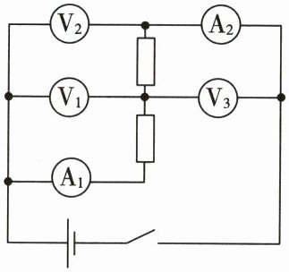 5. 如图所示,电压表 $ V_1 $、$ V_2 $、$ V_3 $ 的示数分别为 $ U_1 $、$ U_2 $、$ U_3 $,电流表 $ A_1 $、$ A_2 $ 的示数分别为 $ I_1 $、$ I_2 $,那么下列关系式正确的是(