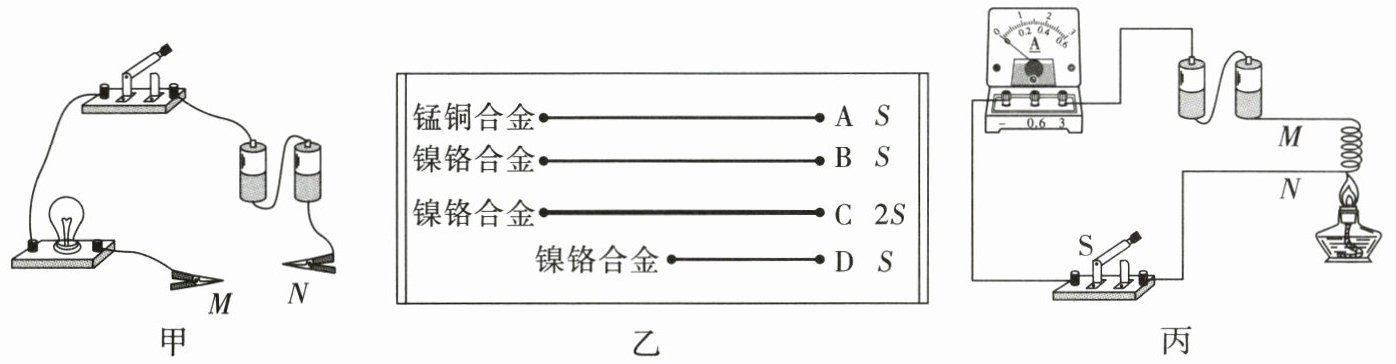 。(5)完成上述实验后,小明进一步进行了如图丙所示的实验,他把 $ M $、$ N $ 与废白炽灯中的钨丝连接,闭合开关 $ S $ 后,用酒精灯给钨丝加热,可以观察到电流表的示数变小,这表明:温度升高,钨丝的电阻