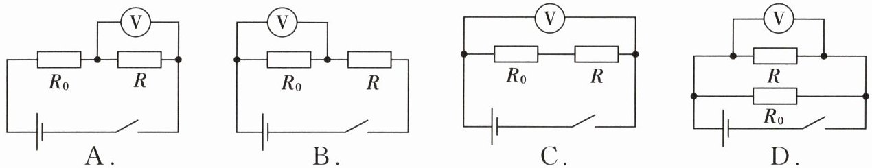 5. 某兴趣小组设计了酒精浓度检测仪的模拟电路,如图所示的电路图中,电源电压保持不变,$ R_0 $ 是定值电阻,$ R $ 是气敏电阻,它的电阻随酒精气体浓度的增大而减小,能实现酒精气体浓度越大,电压表示数越大的电路图是(