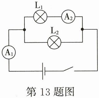 13. 如图所示,电源电压为 $ 3V $,闭合开关后,电流表 $ A_1 $ 的示数为 $ 0.6A $,电流表 $ A_2 $ 的示数为 $ 0.2A $,则通过灯泡 $ L_2 $ 的电流为