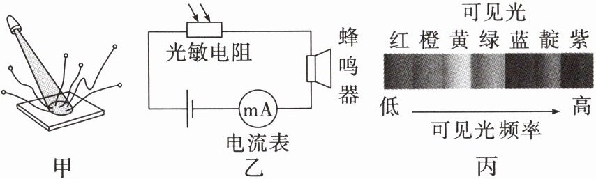 光敏电阻是利用半导体的光电效应制成的一种电阻值随入射光的强度而改变的电阻器。如图乙所示,电源电压恒为 $ 4.5V $,蜂鸣器(视为定值电阻)的阻值为 $ 10Ω $。当光敏电阻正对光源,通过电流表来显示光照强度 $ E $(单位:$ lx $),电流表的示数 $ I $ 随光照强度 $ E $ 变化的关系如表所示。
