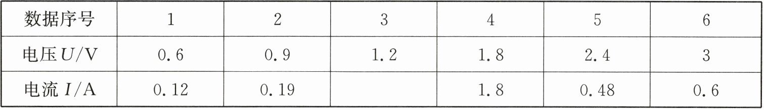 | 电压 $ U/V $ | 0.6 | 0.9 | 1.2 | 1.8 | 2.4 | 3 |