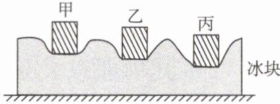 8. 在标准大气压下,将质量相同的甲、乙、丙三块金属加热到相同的温度后,放到上表面平整的冰块上。经过一段时间后,冰块形状不再变化,状态如图所示。则三块金属的比热容大小相比,(