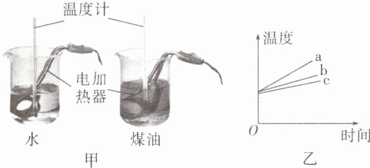 规格的电加热器来加热水和煤油,每隔 $ 1\ min $ 记录一次温度,整个实验操作无误。图乙中,若图线 $ b $ 反映水的温度随时间的变化规律,则图线______a