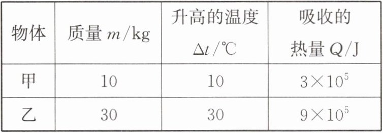 3. 甲、乙两种由不同物质组成的物体,它们的质量、升高的温度及吸收的热量如下表所示。以下说法正确的是(