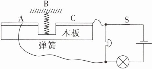 [典例4](2025玉溪期中)如图所示是具有报警功能的文物展示台,它由木板、弹簧、金属片A、B、C和报警电路组成。展示台在B的上方,若把物品搬离,金属片B在弹力作用下与金属片A、C分开。当把物品放在展示台上时,金属片A、B、C接通,电铃____(选填“响”或“不响”),灯泡____(选填“亮”或“不亮”)。