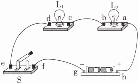 5. 如图所示,闭合开关 S,灯泡$ L_1、$$L_2 $都发光。现将一根导线接在该电路中的某两个接线柱上,会导致两灯同时熄灭的是(