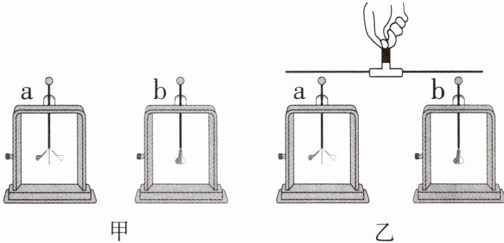 2. (2025 云南阶段练习)将用丝绸摩擦过的玻璃棒接触验电器 a 的金属球,验电器 a 的两片金属箔张开(如图甲所示),再用带有绝缘柄的金属棒把验电器 a、b 两金属球连接起来(如图乙所示)。下列说法正确的是(