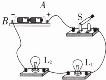 (2)连接完电路后闭合开关 S,灯泡$ L_1 $和$ L_2 $均发光,此时电流方向从$ L_1 $流到$ L_2,$此时的电路叫_________(选填“通路”“断路”或“短路”)。电源外部,正电荷的移动方向从_________流到_________。(最后两空选填“A”或“B”)