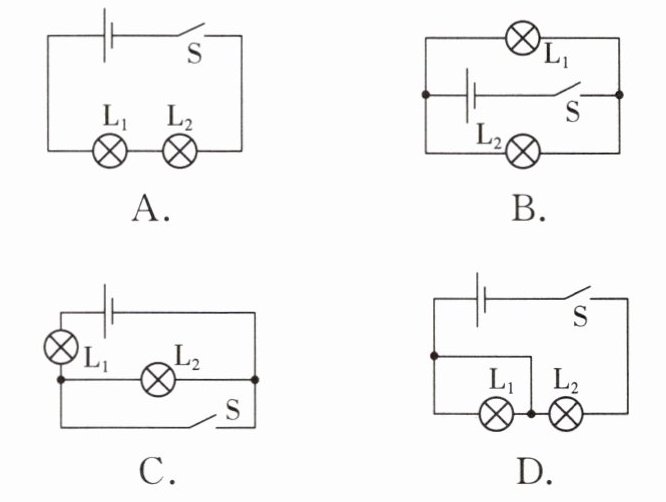 D.解析:A选项中电流只有一条路径,电流依次经过这两个灯泡,因此是串联电路,故A不符合题意;B选项中开关闭合时,电流有两条路径,分别经过这两个灯泡,是并联电路,故B符合题意;C选项中开关断开时,两灯组成串联电路,开关闭合时,灯$L_2$被短路,故C不符合题意;D选项中开关闭合时,灯泡$L_1$被短路,故D不符合题意。