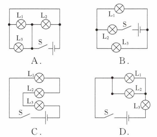 1. 下列选项中,开关闭合时,三盏灯属于并联关系的是(