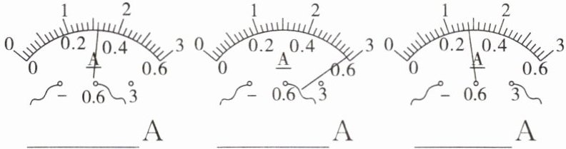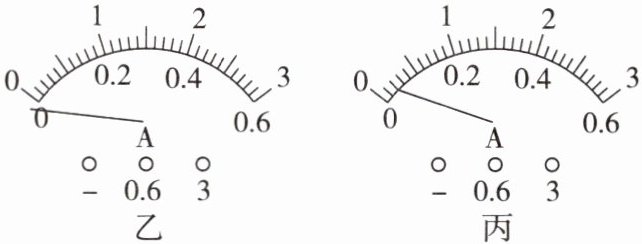 接线柱上。(均选填“$a$”“$b$”“$c$”“$-$”“$0.6$”或“$3$”)(3)两位同学在分组实验中,闭合开关前,他们的电流表指针均指在零刻度处,当闭合开关试触时,发现电流表指针摆动分别出现了如图乙、丙所示的两种情况,则图乙的问题是