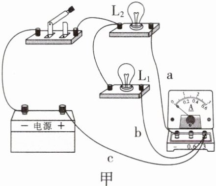 (2)如果要用电流表测通过灯泡$L_{1}和L_{2}$的总电流,且只允许移动一根导线,应将导线______的右端接在电流表的______接线柱上。(均选填“$a$”“$b$”“$c$”“$-$”“$0.6$”或“$3$”)