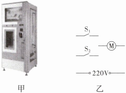 7. 如图甲所示为某款售水机,可通过刷卡(感应开关$ S_{1} $)或投币(投币开关$ S_{2} $)控制电动机取水。根据以上信息,请将电路图乙补充完整。