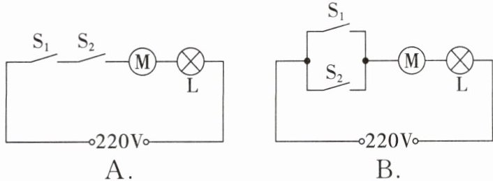 将$S_{1}$和$S_{2}$并联后与电动机$M$串联接入220V电源,电路图如下: