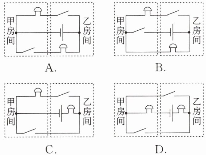 5. 甲、乙为两个独立的房间,当闭合甲房间的开关时,只有乙房间的电铃响;当闭合乙房间的开关时,只有甲房间的电铃响。符合此要求的电路是(