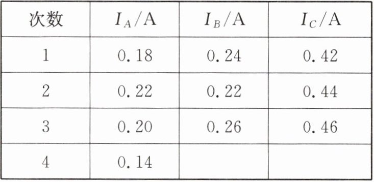 开关。(2)用电流表分别测量$ A $、$ B $、$ C $三点的电流,更换灯泡多次测量,将实验数据记录在表格中,其中第4次实验中$ B $点的电流如图丙所示,则$ I_{B} = $