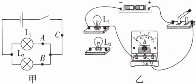 (1)请根据图甲中的电路图,用笔画线代替导线将图乙中的电路连接完整,使电流表测量通过小灯泡$ L_{1} $的电流。连接电路时应