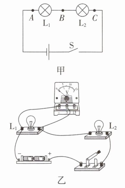 按电路图连接电路,用电压表分别测出$L_1$两端的电压$U_1$、$L_2$两端的电压$U_2$以及电源电压$U$,记录数据。