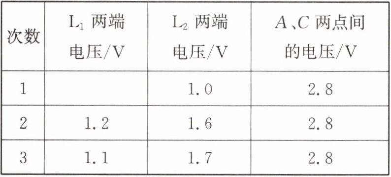 |次数|$L_{1}$两端电压/V|$L_{2}$两端电压/V|$A$、$C$两点间的电压/V|