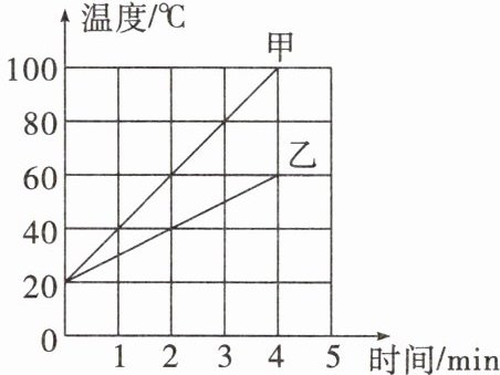 (选填“甲”或“乙”)物质为水,另一种液体在 $4$ min 内吸收的热量为____8.4×10⁴