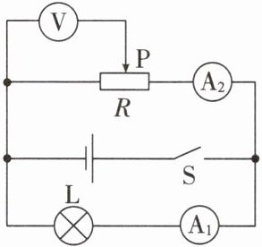 解析:由电路图可知,灯泡L与滑动变阻器并联,电流表$A_1$测灯泡L支路的电流,电流表$A_2$测滑动变阻器支路电流,电压表测滑动变阻器左半部分的电压。将滑动变阻器的滑片P向左移动时,滑动变阻器左半部分电阻变小,分得的电压变小,电压表的示数变小。因并联电路中各支路互不影响,故灯泡L的亮度不变。
