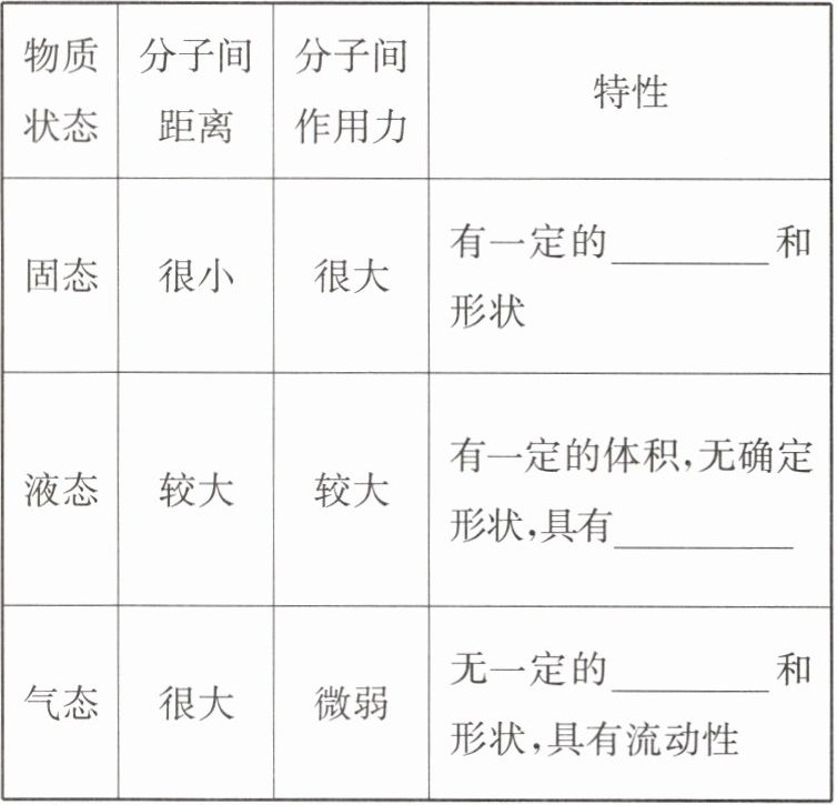 和形状||液态|较大|较大|有一定的体积,无确定形状,具有