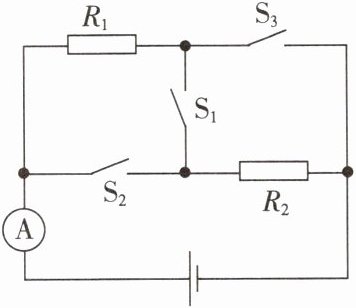 9. 在如图所示的电路中,电阻器 $ R_1 $ 为 $ 20 \, \Omega $,电源电压保持不变。当 $ S_1 $、$ S_2 $ 断开,$ S_3 $ 闭合时,电流表的示数为 $ 0.45 \, A $;当 $ S_1 $ 断开,$ S_2 $、$ S_3 $ 闭合时,电流表的示数为 $ 0.75 \, A $。求: