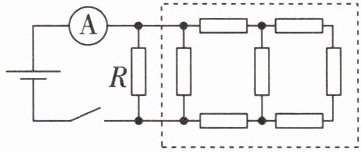 10. 如图所示,电源电压 $ U = 2 \, V $ 不变,$ R = 4 \, \Omega $,虚线框内所有定值电阻的电阻均未知。闭合开关,电流表示数为 $ 1 \, A $。如果用一个 $ 2 \, \Omega $ 的定值电阻替换 $ R $,虚线框内的电阻均保持不变,则电流表示数将变为(