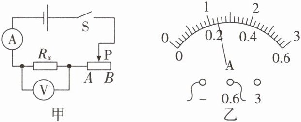 (3) 根据图乙可知,电流表的测量范围为 $ 0 \sim 0.6 \, A $,分度值为 $ 0.02 \, A $,示数为 $ 0.24 \, A $;由题意可知,此时 $ R_x $ 两端的电压 $ U_x = 2.4 \, V $,由欧姆定律可得,$ R_x $ 的电阻 $ R_x = \frac{U_x}{I_x} = \frac{2.4 \, V}{0.24 \, A} = 10 \, \Omega $。